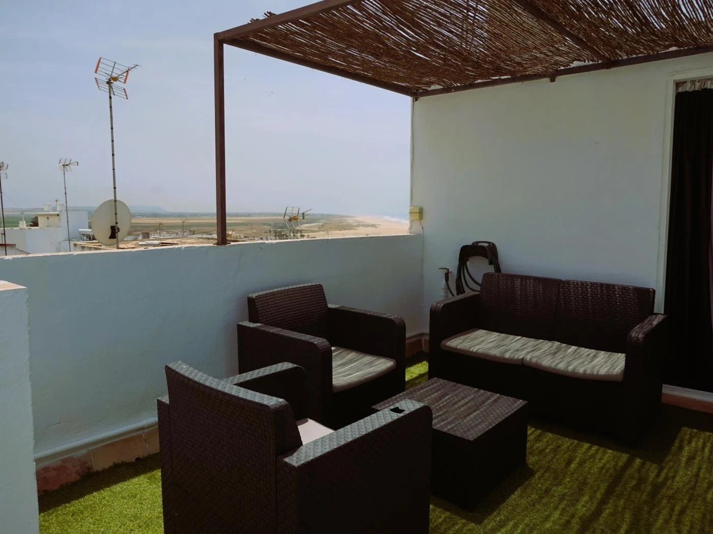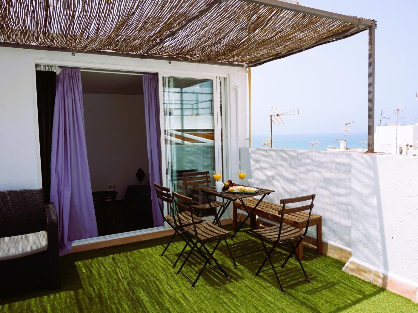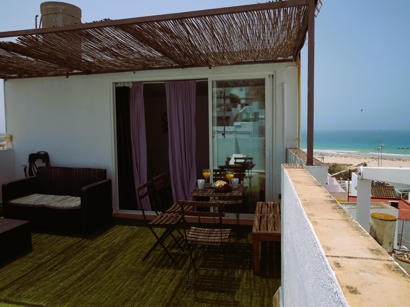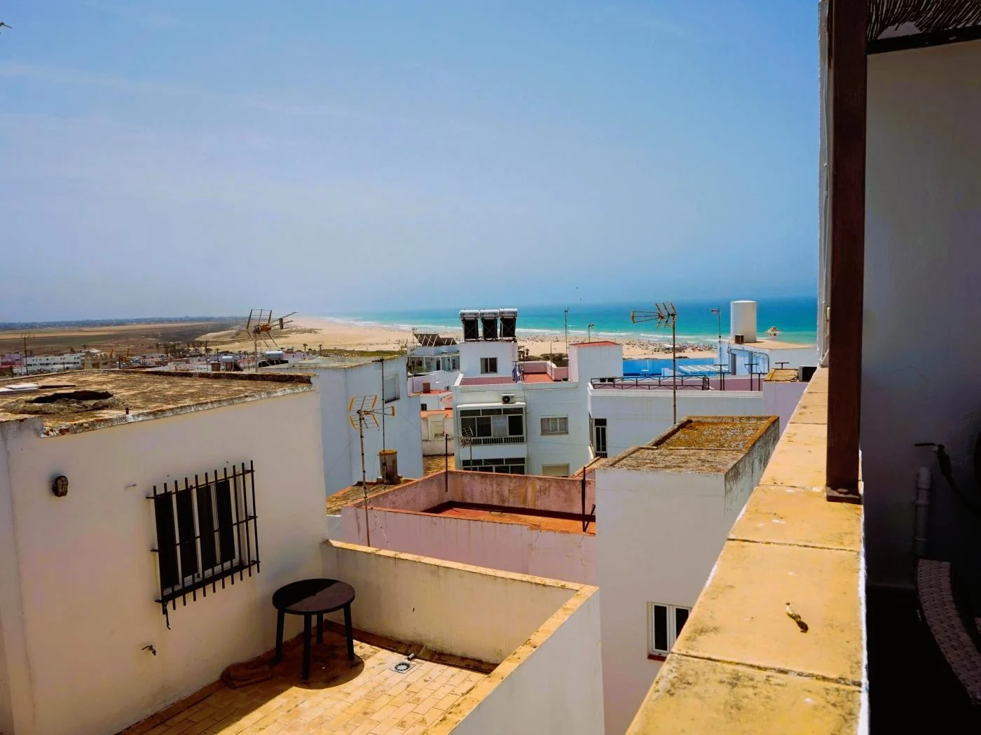 Moderna y espaciosa casa de tres plantas con amplia terraza con vistas al mar. Situada en pleno casco antiguo de Conil con capacidad para 6 personas. La primera planta consta de salón-cocina y un baño. La cocina cuenta con vitrocerámica, campana extractora, microondas, etc. y todo el menaje necesario para 6 personas. En el salón encontraremos una TV de 32′, aire acondicionado y WIFI. En la segunda planta tenemos dos dormitorios y otro baño. El dormitorio principal con cama de matrimonio y el otro con dos camas individuales. En la tercera planta hay una habitación con sofa-cama y salida a amplia terraza.
